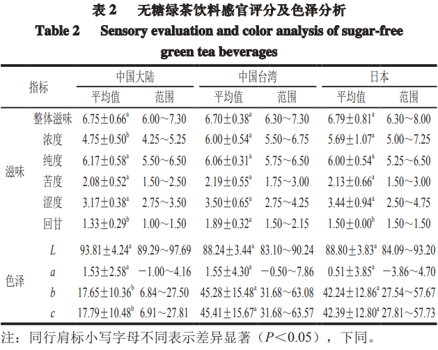 對無糖綠茶飲料樣品進行感官評價,各樣品在肉眼可見的情況下均無雜質與沉淀。如表2所示,整體滋味得分以日本茶飲料最高,3個地區茶飲料整體滋味得分差異不顯著。濃度、苦度、澀度、回甘得分都以中國臺灣茶飲料最高,日本地區居中,中國大陸地區最低,且中國臺灣茶飲料回甘得分與日本、中國大陸地區差異顯著。中國大陸地區茶飲料滋味純度得分及整體色澤透明度最高,色澤均偏紅黃色,3個地區茶飲料的色澤分析結果表明,b值、c值均為中國大陸地區茶飲料<日本地區茶飲料<中國臺灣地區茶飲料,且日本與中國臺灣地區茶飲料顯著高于中國大陸地區。說明日本地區、中國臺灣地區生產的茶飲料較中國大陸地區不僅滋味更濃,而且色澤更黃,中國大陸地區產的茶飲料純度、透明度較高。