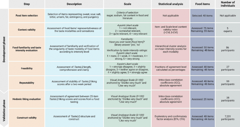 在問卷的開發階段,進行能代表基本味覺、脂肪感、澀感和辛辣感食物的選擇,隨后由小組進行內容效度評估,并評估這些食物的味道和感覺強度。為了確保理解和問卷的穩定性,進行了可行性和可重復性研究。在驗證階段,對一組項目進行了喜好評估,隨后進行了因子分析,以驗證TasteLQ的最終結構。