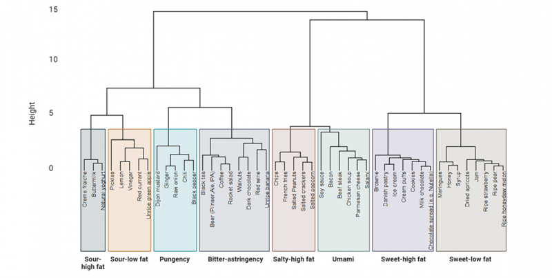 圖2 利用味覺和感覺強度等級對47種食物進行分層聚類分析的樹狀圖
