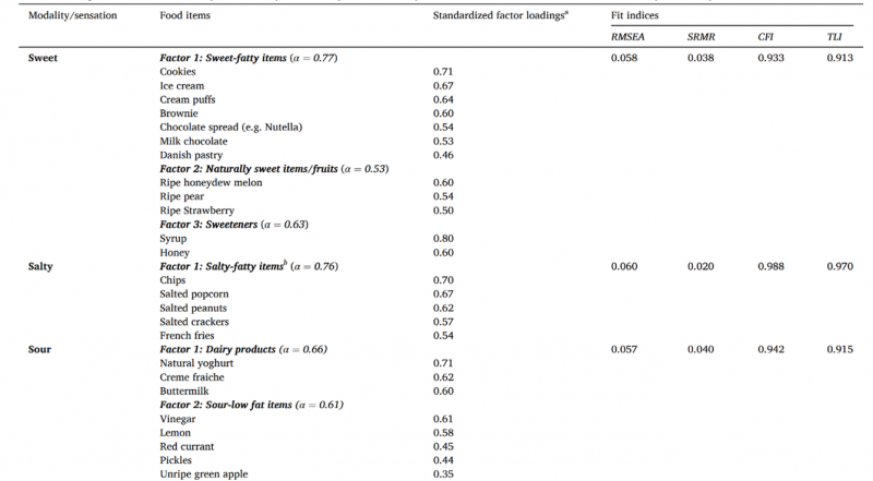 通過對20144名受試者發送問卷,并對7201名完整回答問卷的受試者進行分析,評估了問卷的結構效度。結果顯示,不同味覺形式(如甜味、咸味、酸味等)的項目在因素分析中呈現出一致的結構,支撐問卷的結構效度。