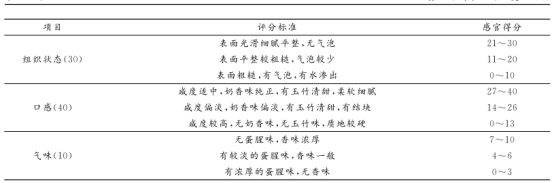 由20名健康無陋習(飲食、生活規律健康,無抽煙酗酒現象等)人士組成評價小組,其中10男10女。對產品的色澤、組織狀態、氣味、口感進行評價,評分標準見表1。