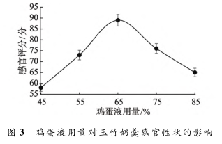 從圖3可以看出,隨著雞蛋液用量的增加,感官評分呈現出先升高后下降的趨勢。當蛋液用量較低時,奶羮里會有多余的水分滲出,導致感官評分較低;當蛋液用量為65%時,奶羮順滑,無水分滲出,可以品嘗出玉竹的清甜味,整體色澤為淡黃色,感官評分最高(89分);當蛋液用量再繼續增加時,奶羮會有蛋腥味,口感較硬,導致感官評分降低。所以,雞蛋液的適宜用量選為65%。