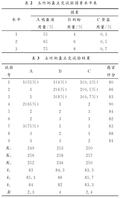 本試驗研究了不同奶粉、雞蛋和食鹽用量對玉竹奶羹感官品質的影響,通過單因素試驗和正交試驗對玉竹奶羹的配方進行了優化,可豐富羹的種類和玉竹食品種類,老少皆宜,市場開發前景廣闊。